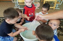 Бүген без су белән тәҗрибәләр үткәрдек. Пакетка су тутырып, аны таяк белән тишеп, тишкәч су акмаганын карап күзәтеп тордык. Һәм безнең сулы пакетыбыздан энәле керпе килеп чыкты. / Сегодня мы провели опыт с водой. Заполнили пакет водой, проткнули его острыми палочками и наблюдали за тем, как вода после прокола не стекала. Из нашего пакета с водой получился ёжик.