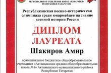 Республикакүләм хәрби-тарихи олимпиадада мәктәбебезнең 7Т сыйныфы укучысы Шакиров Әмир лауреат булды. Котлыйбыз!