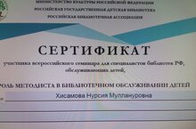 Библиотекарь школы Н.М.Хисамова участвовала во Всероссийском семинаре для специалистов библиотек РФ, обслуживающих детей по теме "Роль методиста в библиотечном обслуживании детей" .