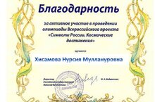 Учащиеся нашей школы Госсамова Зульфия (5б класс),Госсамова Рузиля (7 б класс), Шаймарданов Ильзат (6 в класс), Рахимова Регина ( 8 класс) под руководством библиотекаря Н.М.Хисамовой приняли участие во Всероссийской олимпиаде «Символы России. Успехи в космосе» и были награждены сертификатами.