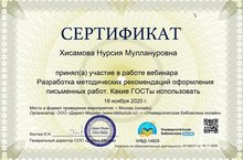 Библиотекарь школы Нурсия Муллануровна приняла участие в работе вебинара "Разработка методических рекомендаций оформления письменных работ. Какие ГОСТы использовать".
