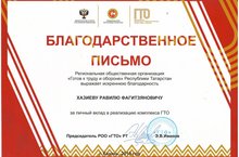 Учитель ОБЖ Хазиев Равиль Фагитзянович награжден благодарственным письмо Региональной общественной организации «Готов к труду и обороне» Республики Татарстан за личный вклад в реализацию комплекса ГТО. Молодец! Поздравляем!