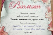 Китапханәчебез Хисамова Нурсия Мулланур кызы "Театр - яктылыкка, нурга илтә..." бәйгесендә катнашып, иң дөрес, иң тулы җаваплар биргән өчен Актаныш җирлекара үзәк китапханәсе директоры рәмәт хаты белән бүләкләнде. Котлыйбыз!