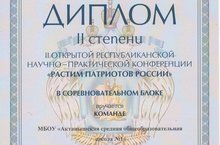 Команда школы в составе учащихся 9-10 классов Газизянова Азата, Гайсина Данила, Фазлиева Нависа, Талипова Алмаза и Басыровой Чулпан заняли II место во II открытой Республиканской научно-практической конференции для обучающихся общеобразовательных организации Республики Татарстан "Растим патриотов России". Поздравляем! Молодцы!