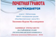 Библиотекарь школы Хисамова Нурсия Муллануровна заняла III место на районном этапе Республиканского конкурса "Лучшая школьная библиотека - 2018". Поздравляем! Желаем дальнейших успехов!
