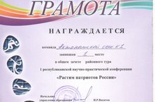 18 января 2018 года на базе ГБОУ «Актанышская кадетская школа-интернат имени Героя Советского Союза Хасана Заманова» состоялся районный тур I республиканской научно-практической конференции «Растим патриотов России». В программе конференции были публичная защита научной работы автором, одним из участником команды, стрельба из ПВ, армрестлинг, конкурс "Ратные страницы истории Отечества". Команда нашей школы в общем зачете заняла I место и награждена почетной грамотой. Молодцы! Поздравляем!