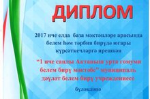 2017 нче елда база мәктәпләре арасында белем һәм тәрбия бирүдә югары күрсәткечләргә ирешкән өчен мәктәбебез коллективы диплом белән бүләкләнде. Котлыйбыз! Киләчәктә дә зур уңышлар телибез!