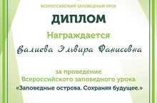 Учитель химии Валиева Эльвира Фанисовна награждена дипломом за проведение Всероссийского заповедного урока "Заповедные острова. Сохраняя будущее". Поздравляем! Желаем дальнейших успехов!