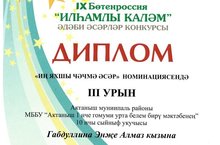 10 нчы сыйныф укучысы Габдуллина Энҗе Казан федераль университеты, Л.Толстой исемендәге филология һәм мәдәниятара багланышлар институты, Бөтендөнья татар конгресы, Татарстан Республикасы язучылар берлеге катнашында үткән IX Бөтенроссия "Илһамлы каләм" әдәби әсәрләр конкурсында катнашып, "Иң яхшы чәчмә әсәр" номинациясендә III урын яулады һәм диплом белән бүләкләнде. Энҗенең укытучысы Галиева Ленара Рафаиль кызына иҗади фикерләү сәләтенә ия укучылар тәрбияләүгә керткән өлеше өчен рәхмәт хаты тапшырылды. Афәрин! Котлыйбыз!