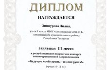 Ученица 9 класса нашей школы Зиннурова Лилия заняла III место в этом конкурсе. Лилия вместе со своим педагогом Исмакаевой Диларой Фирдинантовной была приглашена на церемонию награждения. Ей вручены диплом и ценные призы.