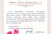 Мәктәбебез коллективы "Өй алдыбыз гөлбакча - 2016" район бәйгесендә, иң яхшы чәччәкләр күргәзмәсе өчен, район үзәге мәгариф учреңдениеләре арасында II урын яулап, районыбызны төзекләнденрү, яшелләндерү, матурлауга керткән хезмәте өчен районыбыз Башлыгы Фаиль Мисбахович Камаевның рәхмәт хаты белән бүләкләнде. Котлыйбыз!
