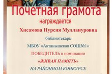 Библиотекарь школы Хисамова Нурсия Муллануровна награждена почетной грамотой за победу в номинации "Живая память" на районном конкурсе буктрейлеров "Расскажу о книге". Поздравляем!