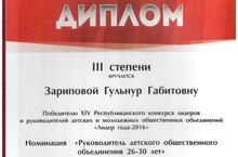 Наш педагог-организатор Зарипова Гульнур Габитовна стала победителем в номинации «Руководитель детского общественного объединения 26-30 лет» и награждена дипломом III степени. Также она стала обладателем памятного кубка и памятных призов. Поздравляем! Так держать!