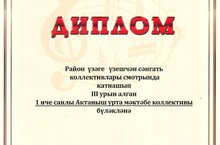 Мәктәбебез коллективы район үзәге үзешчән сәнгать коллективлары смотрында катнашып, III урын яулады һәм диплом белән бүләкләнде.