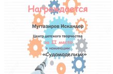 Учащийся 3а класса Мугтазиров Искандер (руководитель - Гимазов Н.Ф.) принял участие в муниципальной выставке творчества учащихся школ и учреждений дополнительного образования района и занял II место в номинации "Судомоделизм", III место - в номинации "Показательные выступления по судомоделированию". Искандер награжден грамотами. Молодец! Поздравляем!