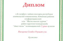 "Ак калфак" хатын-кызлары республика иҗтимагый оешмасының Актаныш районы конференциясе үткәрелде. Чараның "Милли киемле курчак" күргәзмә-конкурсында мәктәбебезнең 3а сыйныфы укучылары Хайдарова Нәркизә һәм Насырова Сөмбел катнашты. Сөмбел II урын яулап, дипломга лаек булды. Нәркизә рәхмәт хаты белән бүләкләнде. Әфәрин, кызлар!