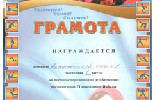 1 апреля состоялась военно-спортивная игра "Зарница". В мероприятии приняли участие школьные команды района. Команда нашей школы в составе учащихся 6-8 классов Галиева Аделя, Ялалова Наиля, Галлямова Айдара, Мирзаянова Айнура, Шайхразиева Рустема, Шайхутдинова Гаделя, Гайсина Данила, Салихова Даниэля, Салахова Ильдара, Газетдинова Азата, Мухаметдиновой Ренаты, Исламовой Чулпан, Баяновой Регины, Гайнуллиной Гульшат завоевала первенство, показав лучшие результаты в одевании ОЗК, строевой подготовке, подтягивании перекладины, военно-исторической викторине, силовых упражнениях. Тренер команды - учитель ОБЖ Хазиев Равиль Фагитзянович. Молодцы! Так держать!