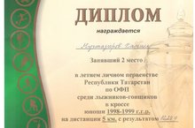 Учащийся 10 класса Мугтазиров Камиль принял участие в Летнем личном первенстве Республики Татарстан по ОФП среди лыжников-гонщиков и на дистанции 5 км с результатом 16,28.9 занял почетное II место среди юношей 1998-1999 г.р. Поздравляем! Молодец, Камиль!