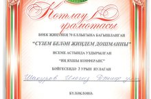 4А сыйныф укучысы Усманова Аделя (сыйныф җитәкчесе - Ахунова Илиза Энгеловна) Казан шәһәрендә үткән I төбәкара фәнни-гамәли конференциядә катнашып, дипломга лаек булды. Шулай ук Аделянең 3 шигыре "Алиш эзләреннә" дип исемләнгән җыентыкта басылды.