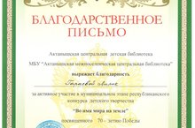 Состоялся муниципальный этап республиканского конкурса детского творчества "Во имя мира на земле", посвященный 70-летию Победы. В конкурсе приняли участие учащиеся нашей школы Гараева Лилия, Хафизова Лилия, Ахунова Алия, Шайхразиева Эльза, Салахов Динар, Амирханова Алсу, Шамсунов Гумар, Загертдинов Ильмир, Басырова Чулпан, Зямилова Назлия. Ребята награждены благодарственными письмами МБУ "Актанышская межпоселенческая центральная библиотека".