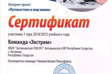 Команда "Экстрим" нашей школы награждена сертификатом участника 1 тура 2014/2015 учебного года Интернет-проекта "Путешествие в мир химии".