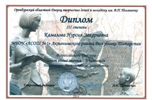 Поздравляем учителя начальных классов Камалову Нурсию Закариевну за диплом III степени в номинации "Методические разработки" Всероссийскоого конкурса "Нет выше звания - Учитель!" .