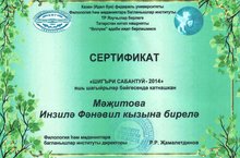 Казан (Идел буе) федераль университеты, Филология һәм мәдәниятара багланышлар институты,ТР Язучылар берлеге, Татарстан китап нәшрияте, "Әллүки әдәби иҗат берләшмәсе үткәргән "ШИГЪРИ САБАНТУЙ - 2014" яшь шагыйрьләр бәйгесендә катнашкан Мәҗитова Инзилә сертификат белән бүләкләнде.