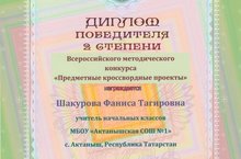 Дипломом победителя 2 степени Всероссийского методичесого конкурса "Предметные кроссвордные проекты" награждена учитель начальных классов Шакурова Фаниса Тагировна. Поздравляем!