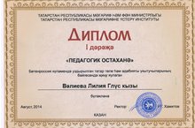Валиева Лилия Глүс кызы Бөтенроссия күләмендә уздырылган татар теле һәм эдәбияте укытучыларының бәйгесендә җиңү яулады һәм I дәрәҗә дипломга ия булды. Әфәрин! Котлыйбыз!