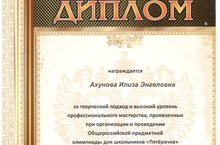 За творческий подход и высокий уровень профессионального мастерства, проявленные при организации и проведении Общероссийской предметной олимпиады для школьников "Пятерочка" учитель начальных классов Ахунова Илиза Энгеловна награждена дипломом.