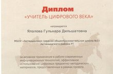 За активное применение в работе современных технологий, эффективное использование цифровых предметно-методических материалов, предоставленных в рамках общеросскийского проекта "Школа цифрового века" учитель информатики Ялалова Гульнара Дильшатовна награждена дипломом "Учитель цифрового века". Спасибо за Ваш труд, Гульнара Дильшатовна!