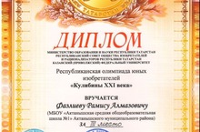 Поздравляем Фазлиева Рамиса (учитель - Фазлиев А.Г.), занявшего III место на Республиканской олимпиаде юных изобретателей "Кулибины XXI". Учитель и ученик награжены дипломами, денежными призами и памятной медалью. Молодцы! Дальнейших Вам успехов!