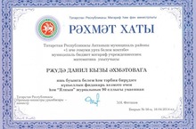 Яшь буынга белем һәм тәрбия бирүдәге купьеллык фидакарь хезмәте өчен һәм "Ялкын" журналының 90 еллыгы уңаеннан математика укытучысы Рҗүдә Данил кызы Әхмәтова рәхмәт хаты белән бүләкләнде. Бездән дә рәхмәт һәм котлау сүзләрен кабул итеп алыгыз, Рҗүдә Даниловна!