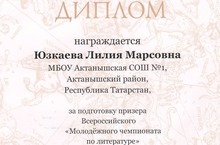 Дипломом за подготовку призера Всероссийского "Молодежного чемпионата по литературе" награждена учитель индивидуального обучения Юзкаева Лилия Марсовна. Поздравляем!