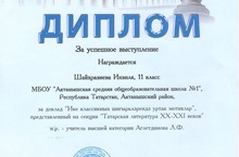 Дипломом за успешное выступление награждена ученица 11 класса Шайхразиева Инзиля за доклад "Ике классикның шигырьләрендә уртак мотивлар", представленный на секции "Татарская литература XX-XXI веков" (научный руководитель - Аглетдинова Л.Ф.). Молодец, Инзиля!