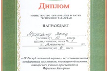 Поздравляем ученицу 10 класса Мустафину Элину, занявшую II место в IX Республиканской научно-исследовательской конференции, посвящённой памяти татарского учёного-просветителя Ибрагима Хальфина. Молодец, Элина!