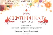 Учитель начальных классов Валиева Лилия Глюсовна награждена сертификатом за подготовку победителей I тура VI Всероссийской дистанционной олимпиады по математике для 1-2 классов.
