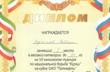 Ученик 7А класса Нургалиев Раббани занял I место в весовой категории до 40 кг на VII юношеском турнире по национальной борьбе "Көрәш" на кубок ОАО "Татнефть", посвященном памяти чемпиона России и РТ по национальной борьбе "Көрәш", мастера спорта РТ, чемпиона мира по борьбе на поясах Валиева Булата Зиннуровича. Молодец, Раббани!