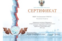 Сертификатами от вице-президента Центра Национальной Славы были награждены следующие наши учащиеся: Салахова Алина, Мухаметзянова Айназ, Акмалова Лилия, Ибрагимов Камиль, Ахметдинова Ильзира, Исхаков Искандер. Молодцы, ребята!