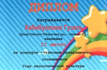 Ученица 4Б класса Хабибуллина Гузель награждена дипломом за II место на конкурсе "Чудесные превращения", посвященном Году экологической культуры и охраны окружающей среды в Республике Татарстан. Молодец, Гузель!