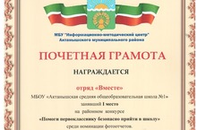 Почетной грамотой награжден отряд "Вместе" нашей школы, занявший I место на районном конкурсе "Помоги первокласснику безопасно прийти в школу" среди номинаций фотоотчетов. Руководители: заместитель директора по воспитательной работе - Мансуров А.М., педагоги-организаторы - Зарипова Г.Г., Амирянова А.М. Отряд прошел на республиканский уровень конкурса. Желаем вам дальнейших успехов, ребята!