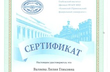 Учитель начальных классов Валиева Лилия Глюсовна награждена сертификатом Елабужского института (филиала) ФГАОУ ВПО "Казанский (Приволский федеральный университет" за проведение мастер-класса на тему: "Фигыль" ("Инновационные подходы в преподавании татарского языка в условиях ФГОС ОО".