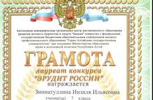 Ученица 7 класса Зиннатуллина Инзиля награждена грамотой лауреата конкурса "Эрудит России". Молодец, Инзиля!