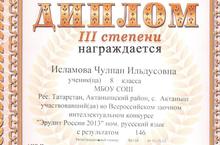 Ученица 8 класса Исламова Чулпан участвовала во Всероссийском заочном интелектуальном конкурсе "Эрудит России 2013" и стала обладательницей диплома III степени. Молодец, Чулпан!