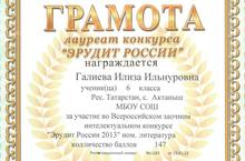 Ученица 6 класса Галиева Илиза награждена грамотой лауреата конкурса "Эрудит России 2013". Так держать, Илиза!