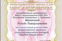 Поздравляем ученицу 5а класса Ахметдинову Ильзиру (учитель Маликова Р.Т.)с успешным участием во Всероссийском заочном конкурсе "Эрудит России 2012" по математике (160 баллов). Молодцы!