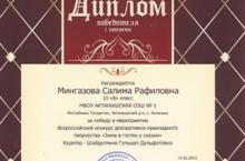 Поздравляем ученицу 10б класса Мингазову Салиму с победой в Всероссийском конкурсе декоративно-прикладного творчества "Зима в гостях у сказки" (куратор - учитель технологии Шайдуллина Гульшат Дульфатовна). Молодцы, так держать!