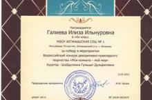 Поздравляем ученицу 6а класса Галиеву Илизу с победой в Всероссийском конкурсе декоративно-прикладного творчества "Моя комната-мой мир" (куратор- учитель технологии Шайдуллина Гульшат Дульфатовна). Молодцы, так держать!