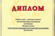 Мәктәбебез коллективы район үзәге үзешчән сәнгать коллективлары смотрында катнашып, III урын яулады һәм диплом белән бүләкләнде.
