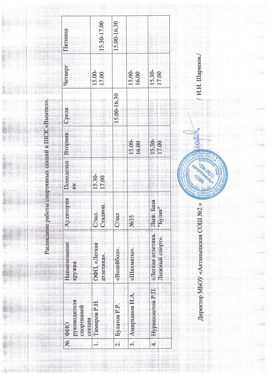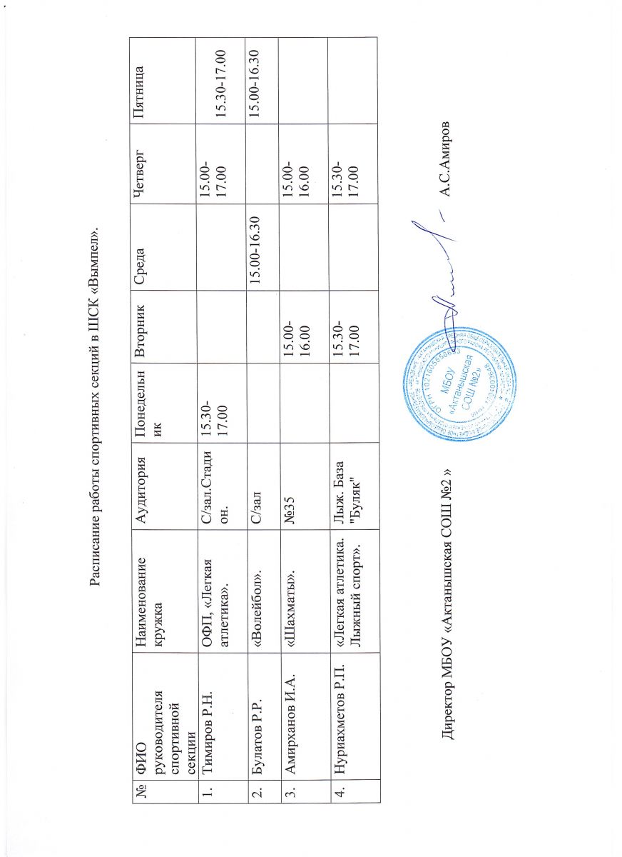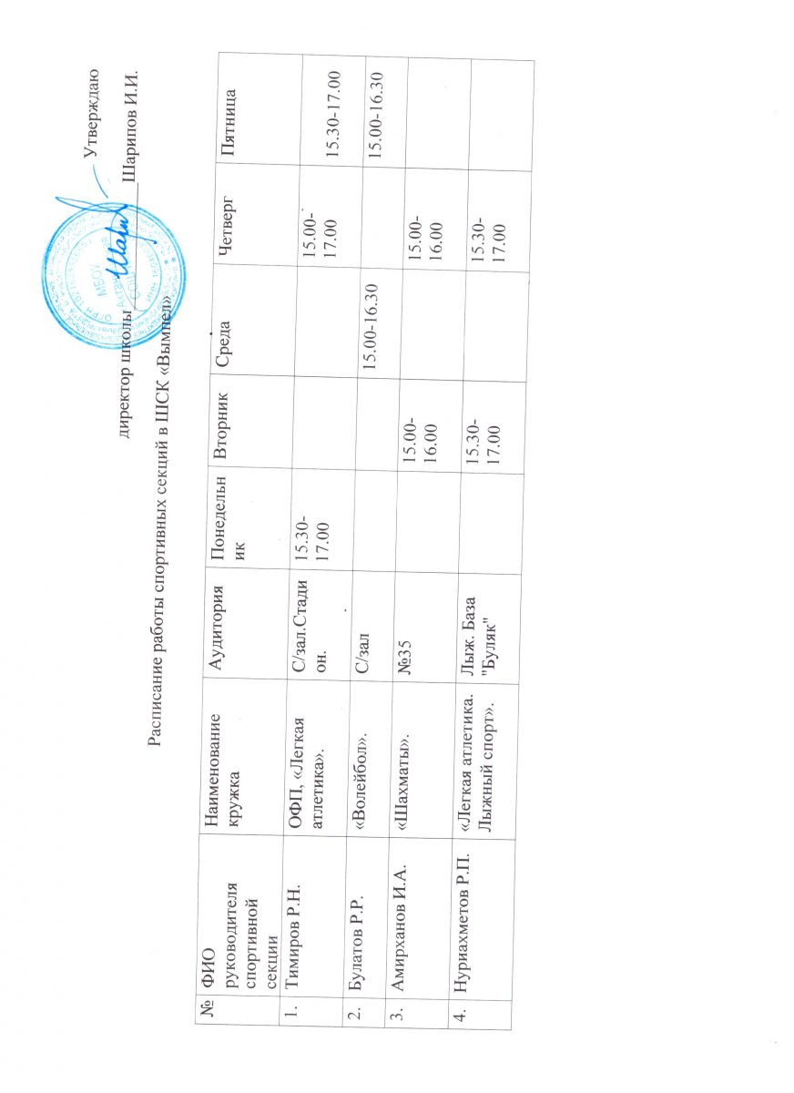 Расписание работы спортивных секций в ШСК «Вымпел».